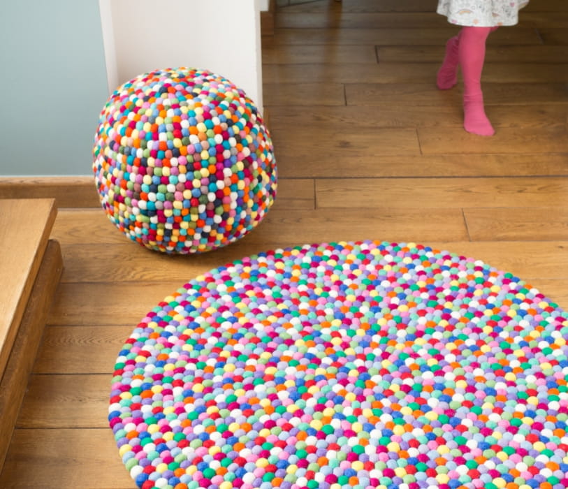Postawienie stopy na takim dywanie to zupełnie nowe doznanie. Kulki są miłe w dotyku, a ich nieregularna powierzchnia masuje stopy. Zastosowana w nich sfilcowana wełna ociepla, wygłusza, oddycha… a przy tym jest w 100% naturalna.