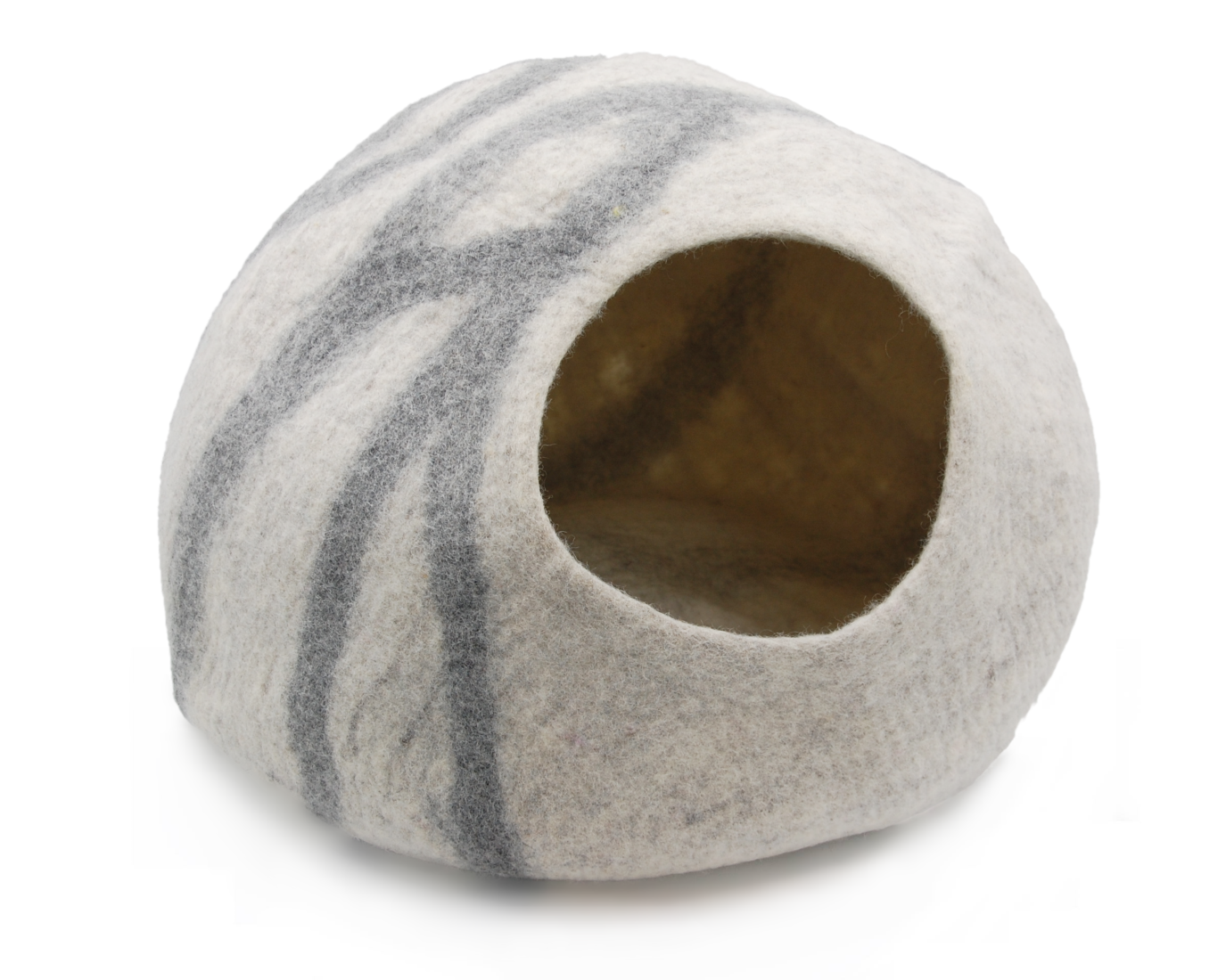 Filcowy kojec dla kota – kamyk wykonany ręcznie w Nepalu. Posłanie formowane jest na mokro w 100% z naturalnej owczej wełny. Duże wymiary i odpowiednia średnica otworu pozwolą wygodnie korzystać z kojca wszystkim leniuchującym kotom. Oprócz praktycznego wykorzystania przez Twojego pupila posłanie może dostosować się jak i podkreślić wnętrze. Ciekawa forma pozwala postawić je nawet w najbardziej reprezentacyjnym miejscu 🙂