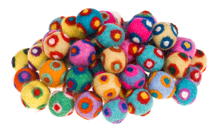Kulki filcowe z Nepalu. Wykonane ręcznie z jednego z najstarszych wyrobów włókienniczych – filcu. Używany do produkcji filc powstaje w 100% z czystej, owczej wełny. Oferowane kulki są wielokolorowe i mają ok. 2 cm średnicy i sprzedawane są w opakowaniach mix kolorów po 25 szt. Wyczaruj z nich piękne wyroby, które będą cieszyć Ciebie i Twoich bliskich.