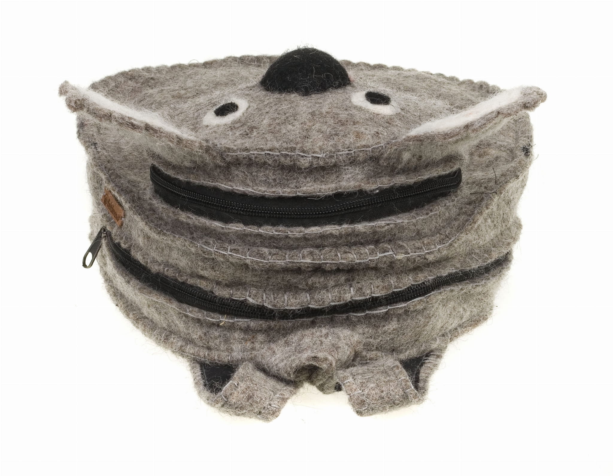 Przepiękny dziecięcy plecak wykonany ręcznie w Nepalu z filcowanej, owczej wełny. Regulowane paski na ramiona. Główna komora oraz dodatkowa kieszonka z przodu zamykane na zamek błyskawiczny. Bawełniana podszewka. U góry niewielka rączka do wygodnego przenoszenia. Plecak wykonany wyłącznie z naturalnych materiałów zgodnie z zasadami Fair Trade.