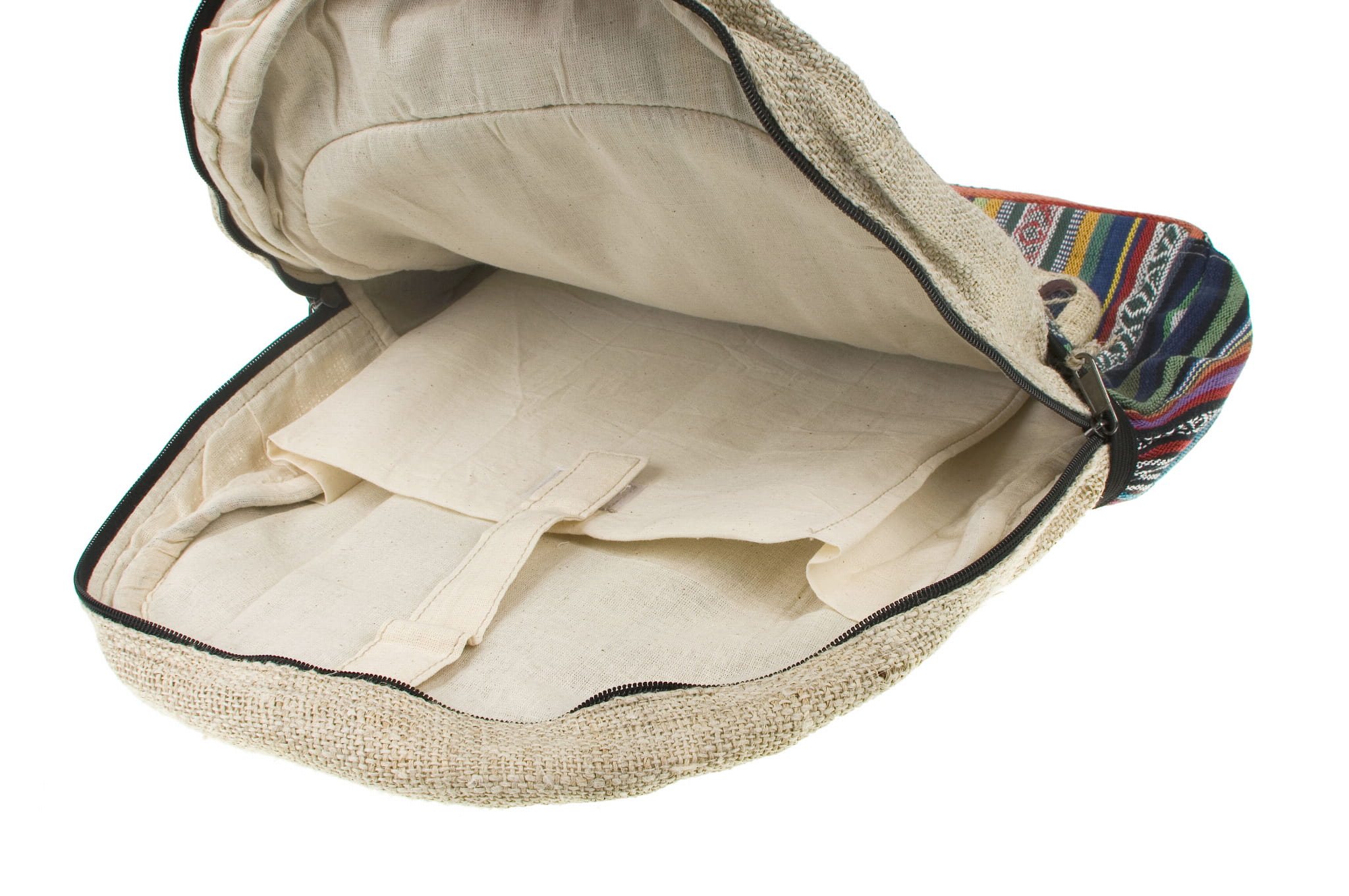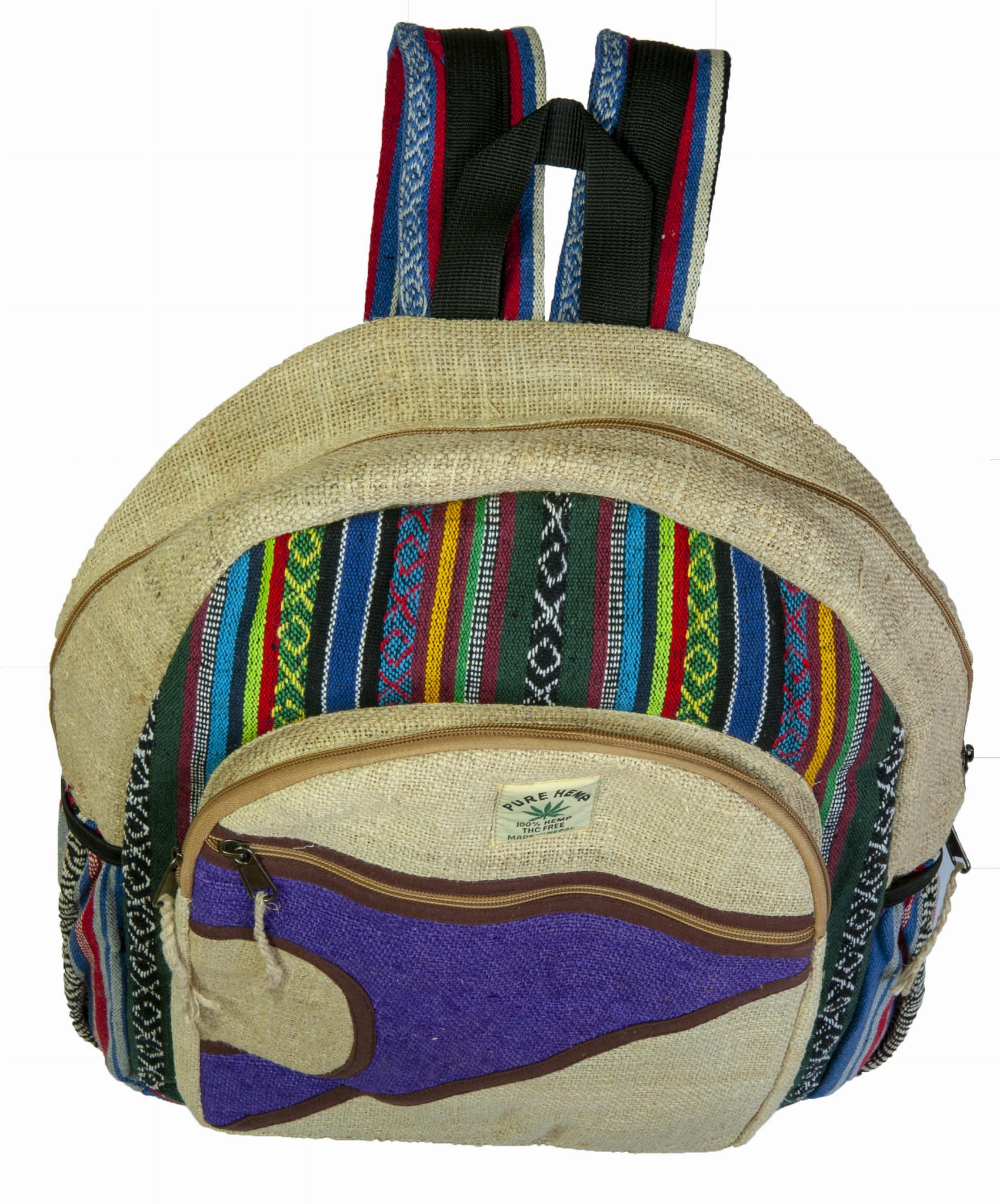 Plecak wykonany ręcznie w Nepalu z naturalnych włókien: konopi himalajskich oraz mocnej bawełny. Regulowane paski na ramiona. U góry rączka do wygodnego przenoszenia. Główna komora zamykana na zamek jest wystarczająco duża żeby pomieścić podręczniki, laptop ale także wszystko co potrzeba na weekendową wycieczkę. Dodatkowe kieszonki ułatwią organizację i przenoszenie mniejszych przedmiotów. Na zewnątrz po bokach plecaka dwie kieszenie na sprzęt podręczny, butelkę wody czy parasol. Ten oryginalny i kolorowy plecak świetnie sprawdzi się na co dzień ale także na wycieczki. Plecak wykonany jest w nepalskiej manufakturze z naturalnych materiałów zgodnie z zasadami Fair Trade. Wymiary 38 x 45 cm.
