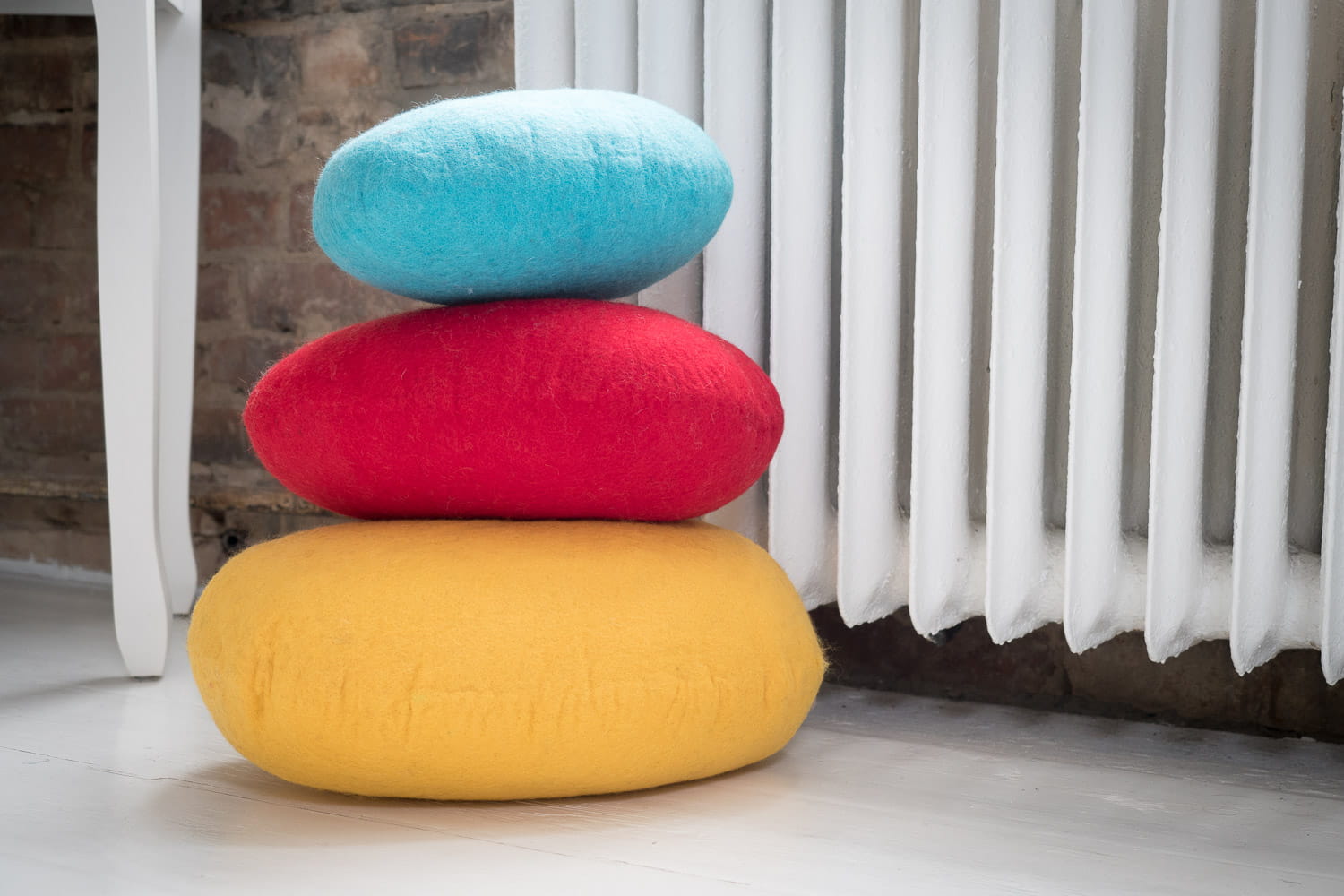 Pufa filcowa wykonana ręcznie z owczej wełny. Dzięki użyciu naturalnych materiałów zapewnia przyjemne ciepło oraz izoluje przed zimnem a przy tym jest bardzo elastyczna i trwała w użytkowaniu. Nadaje wyjątkowego charakter każdemu wnętrzu. Doskonale sprawdza się jako wygodna poduszka ale także w roli niewielkiej wełnianej pufy zwłaszcza w miejscach gdzie wygodnie jest na chwilę przysiąść. Trudno znaleźć ograniczenia w wykorzystaniu. Pufy / poduszki doskonale wyglądają w zestawach po kilka sztuk.