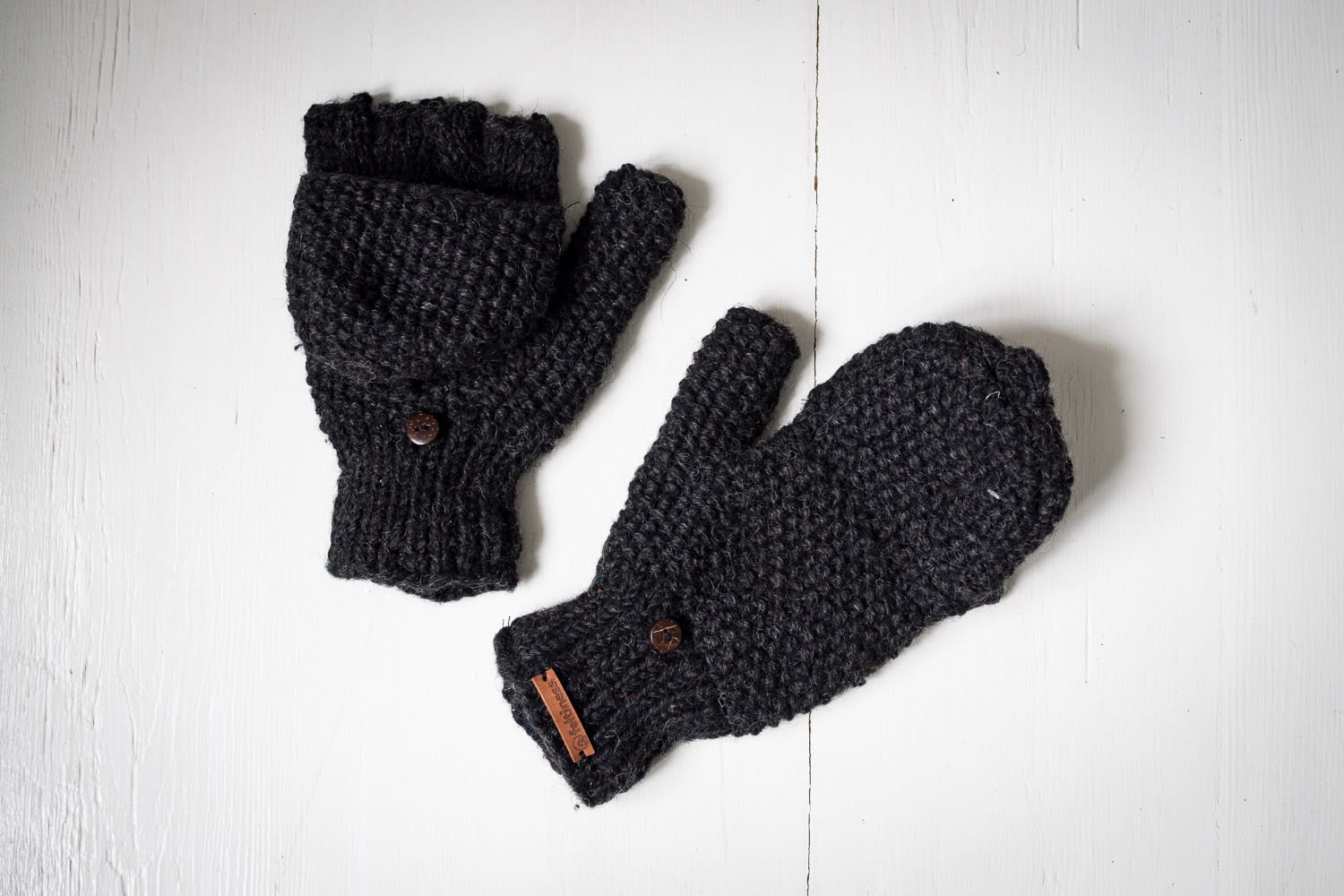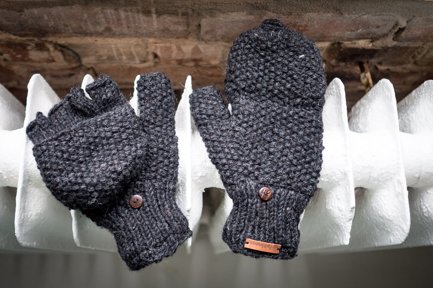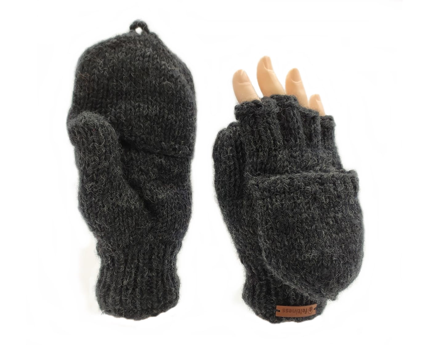 Rękawiczki z klapką wykonane ręcznie w Nepalu, z naturalnej owczej wełny. Można je nosić zarówno z zakrytymi jak i odkrytymi palcami (klapka zapinana na stylowy guzik). Bardzo ciepłe i miłe w dotyku, dodatkowego komfortu w użytkowaniu dodaje podszewka wykonana z miękkiego polaru. Nosząc te rękawiczki poczujesz naturalne ciepło, które pozwoli twoim dłoniom przetrwać zimę. Nadają się dla każdego, zwłaszcza dla tych, którzy wykonują różne czynności na zewnątrz wymagające pomocy palców.