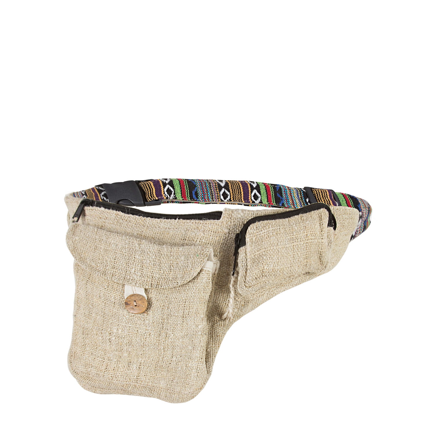 Biodrówka wykonana ręcznie w Nepalu z naturalnych włókien: konopi himalajskich oraz mocnej bawełny. Posiada dwie komory zapisane na wysokiej jakości zamek błyskawiczny oraz regulowany pasek (maksymalny obwód do 110 cm). Wnętrze wykończone jest bawełnianą podszewką.